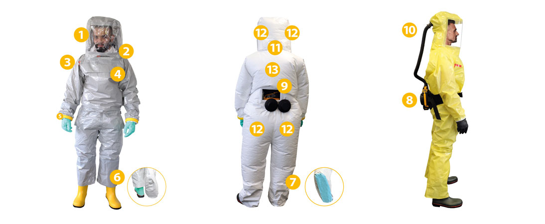 Die einteiligen Überdruck-Atemschutzanzüge bieten höchste Schutzwirkung gegen Gase, Dämpfe, flüssige Chemikalien, radioaktive Kontamination sowie Schutz gegen feste und flüssige Aerosole und Partikel. Die Anzüge werden in Kombination mit einem zugelassenen Atemschutzgebläse oder einem Druckluft-Regelventil eingesetzt. Sie sind jeweils in zwei Ausführungen, mit innenliegendem Gebläse oder außenliegender Luftquelle, verfügbar.