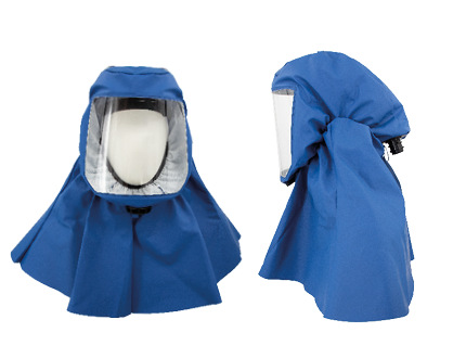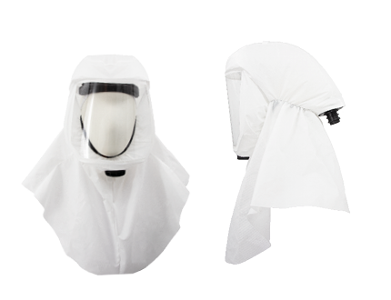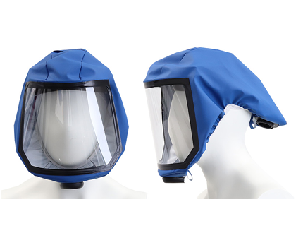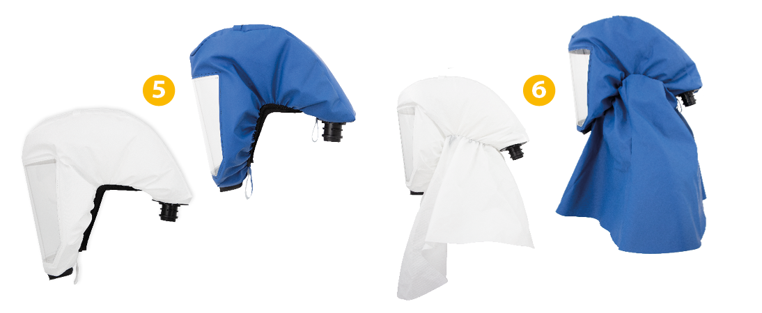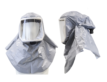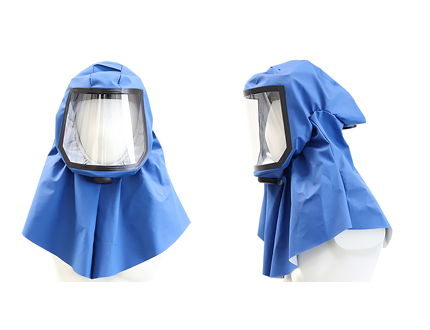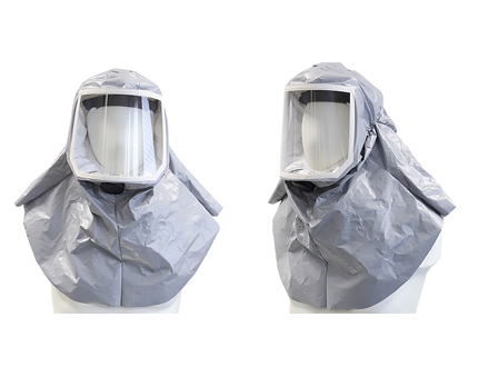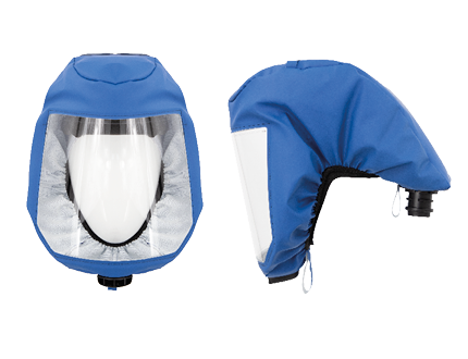 Die langen Hauben haben eine zusätzliche Kopf- und Schulterabdeckung und bieten Schutz für den gesamten Kopf- und Halsbereich. Die Abdeckung kann innerhalb oder außerhalb des Anzugs getragen werden. Wird sie innen getragen, wird der Anzug mit überschüssiger Luft versorgt.